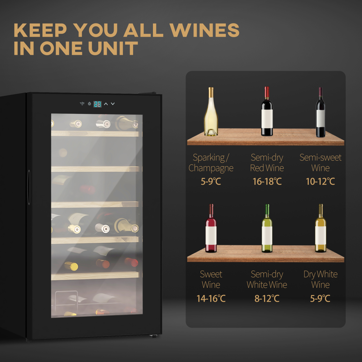 Customize your wine's chill with adjustable temperature settings ranging from 5°C to 20°C, allowing you to select the ideal temperature for each bottle. The advanced LED touch control panel not only lets you set the desired temperature but also displays both the set and actual internal temperatures, keeping you informed at all times!