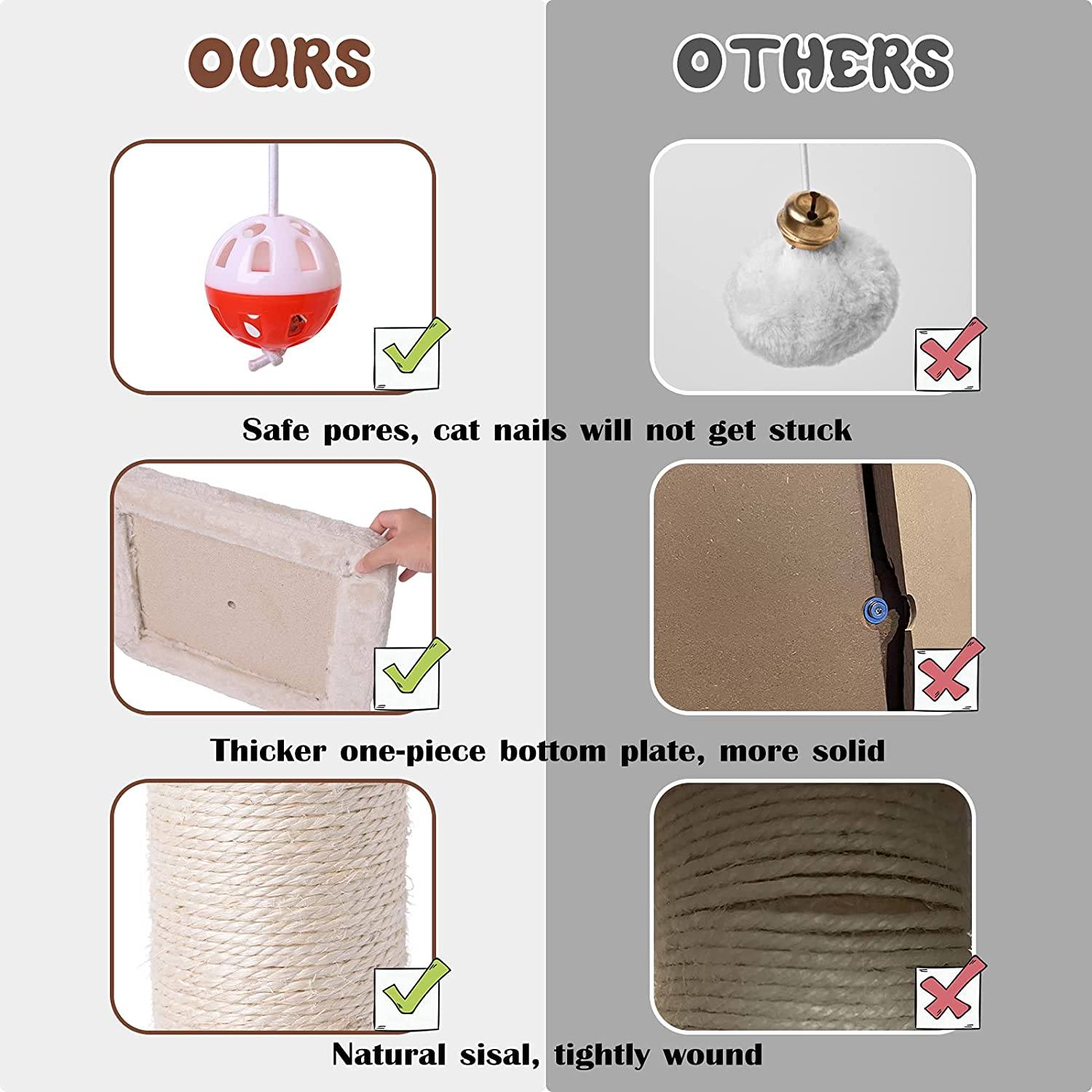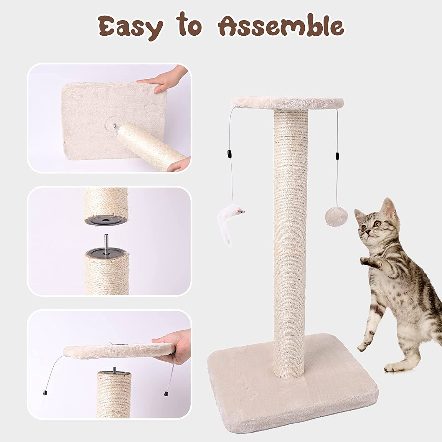 - CAT'S OWN TERRITORY: 30” height cat scratching post allows cat to stretch, The top hanging toys can attract the cat's attention and let it play, durable 3.1 " diameter natural sisal column satisfies cat’s need to sharpen nails, bringing the cat's curiosity to this new toy instead of furniture. 15.7" wide bottom covered with soft smooth plush provides a resting space for the tired cat. Scratcher fully meet cats needs, can completely let cats release their nature.