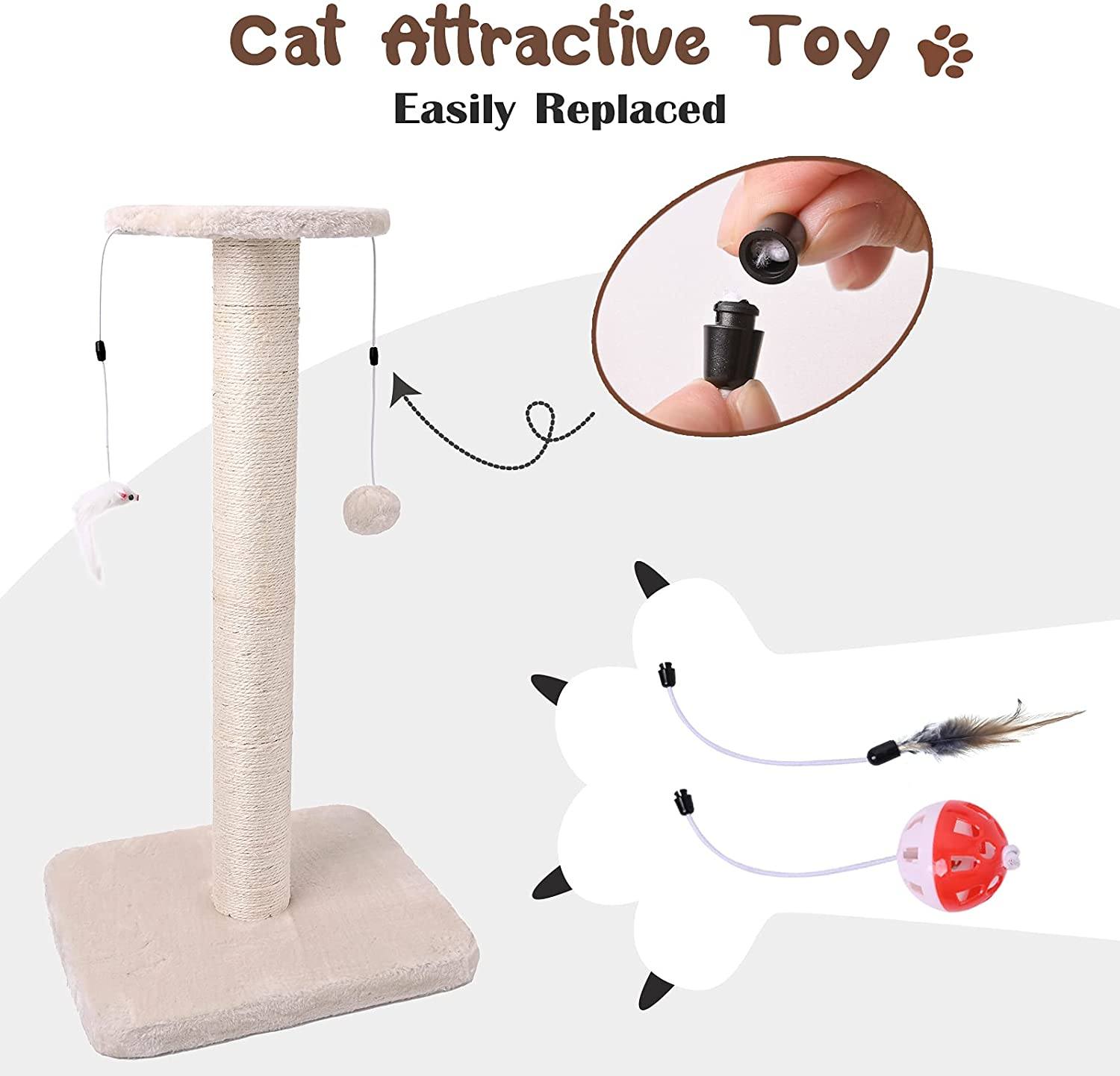 - FOUR REPLACEABLE INTERACTIVE TOYS: We specially selected four attractive interactive toys for cats. You can choose two to hang on the scratch tower. The toy and the scratching post are connected by elastic ropes, bringing more joy to cats. If you want to replace the cat toy, just open the connection at an angle.