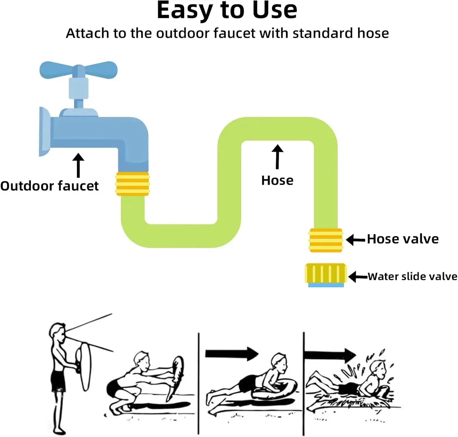 3 IN 1 WATER SLIDE FOR KIDS: Double water slip with giant slides, slip& sprinkler all in one! The spray column in the middle of the water slides ensures even water distribution and reduces friction. Our water slides must inflate the crash pad and connect the slide to your garden hose before we can play. Even if you don't have an outdoor hose, you can use a bucket of soapy water to make the slide extra slippery