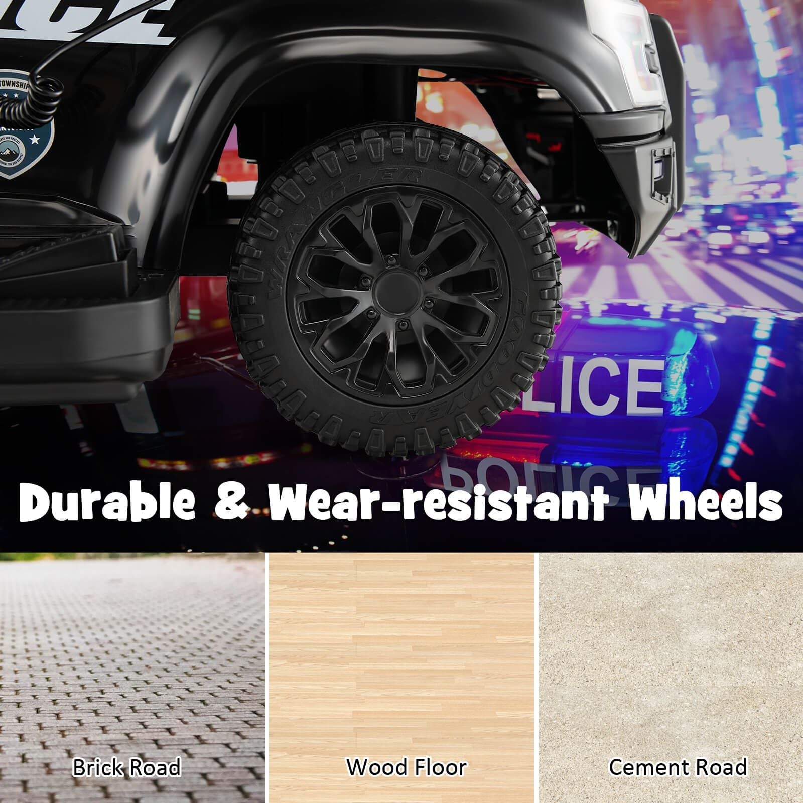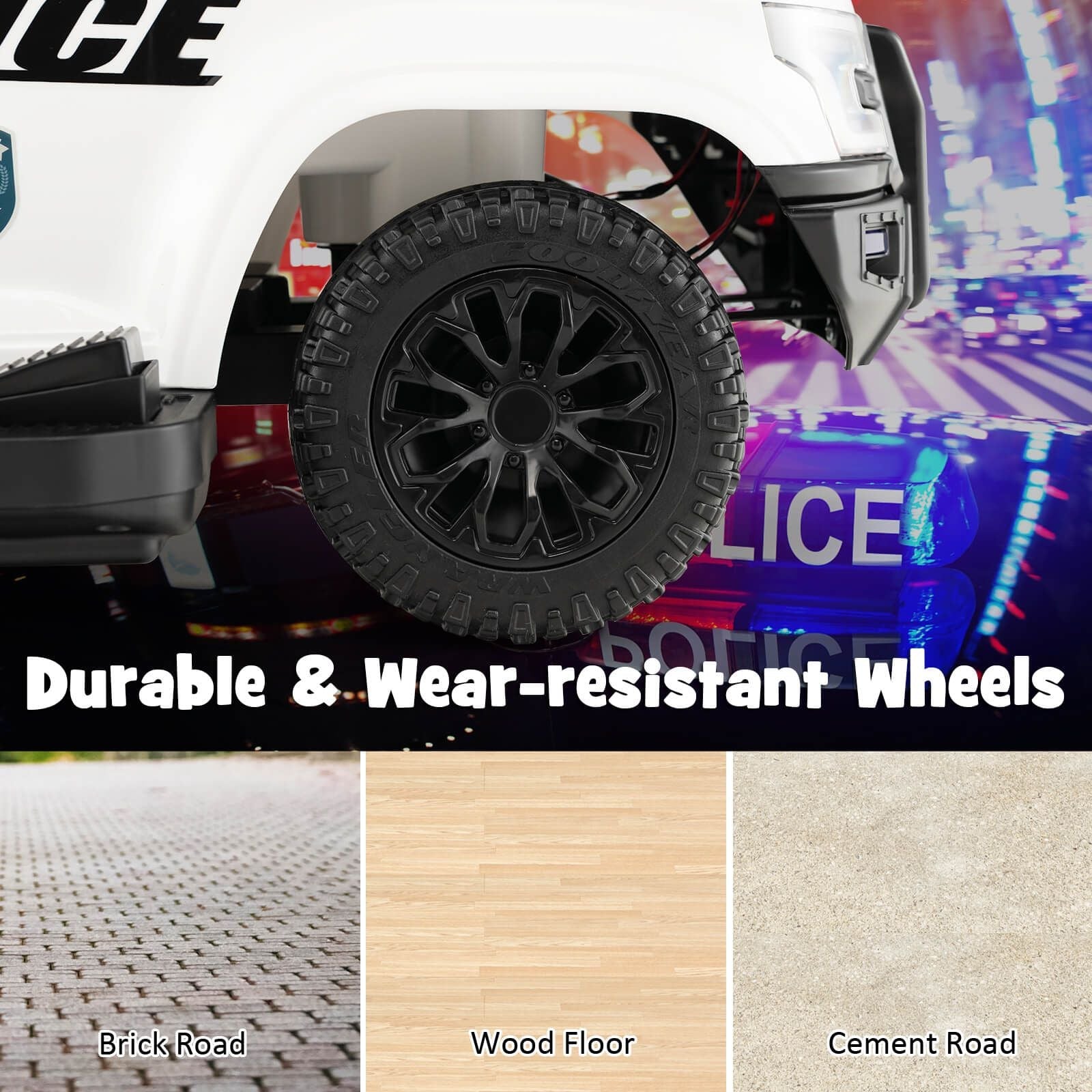 Realistic Driving Experience: With a 6V rechargeable battery and a built-in strong motor, this toy police car can reach a safe speed of 1.86 mph. On the other hand, with durable and wear-resistant wheels, this riding toy is suitable for different road conditions, such as wood floor, cement road, brick road and more .