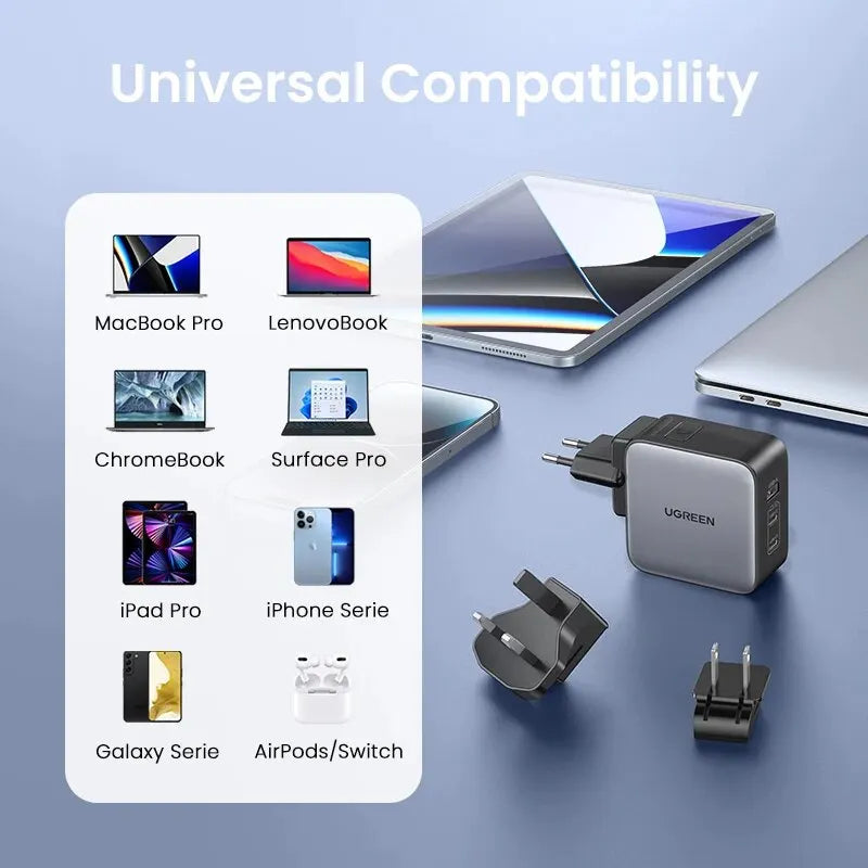 ● Global Compatibility: The travel adapter is equipped with multiple plug types to ensure compatibility with outlets in different countries. This feature makes it suitable for international travel, eliminating the need for multiple adapters.