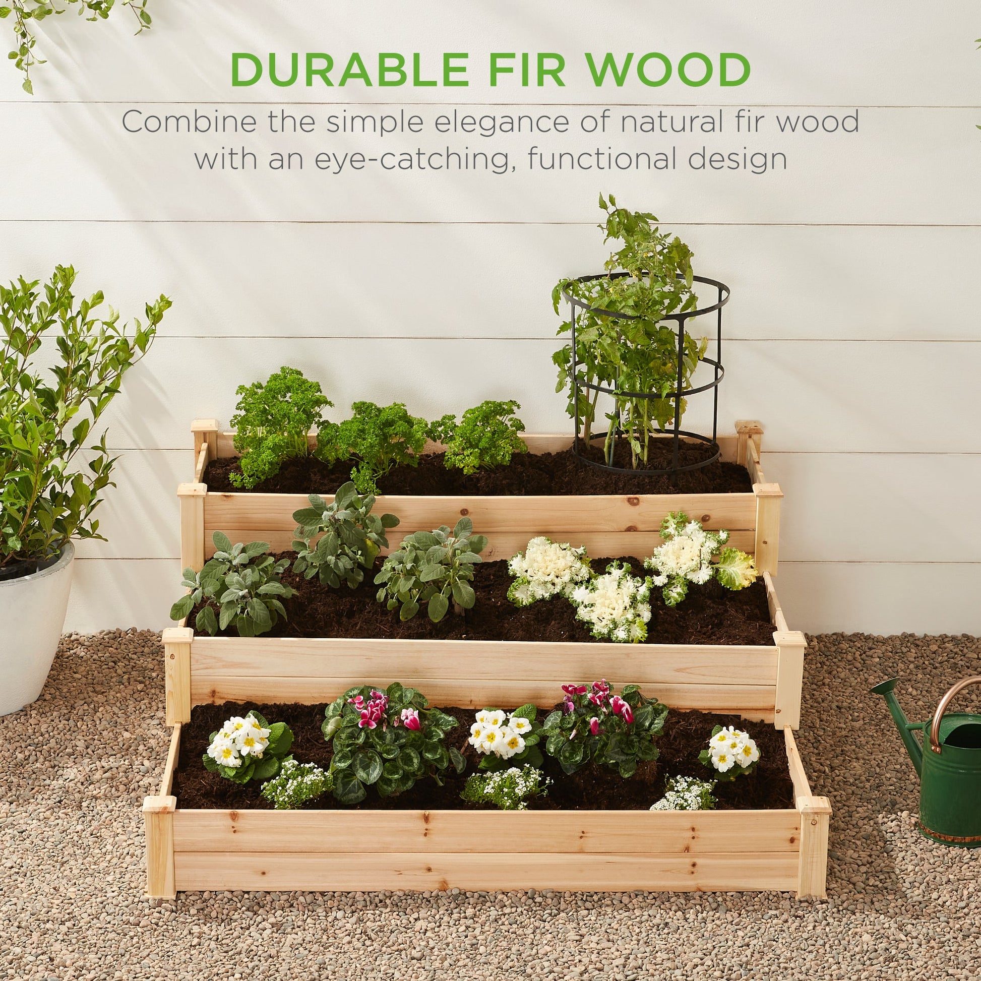 3-Tier Raised Fir Wood Garden Bed Planter w/ Stackable & Flat Setup