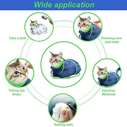 - Adjustable Drawstring - Cat bath bag covers the cat’s whole body, with 5 drawstrings. The new headgear drawstring is added to prevent being bitten by the cat’s teeth, and the foot drawstring prevents being scratched by the cat’s claws, easy to cut nails. The middle drawstring can better fix the cat’s body to prevent the cat from running away.