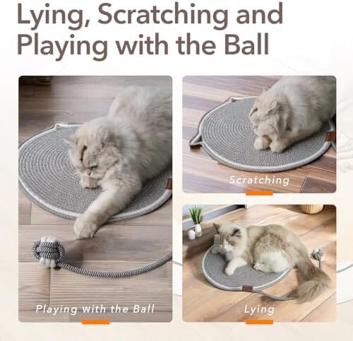 - Multi-functional Design: Featuring a hollow-out cat ear design, it can easily be fixed on walls, furniture, or sofas with hooks, protecting your walls and furniture from cat claw damage. Also, This cat mat can be used as a scratching post, a cozy bed for your furry friend to sleep on, and even a play area with the attached toy ball.
