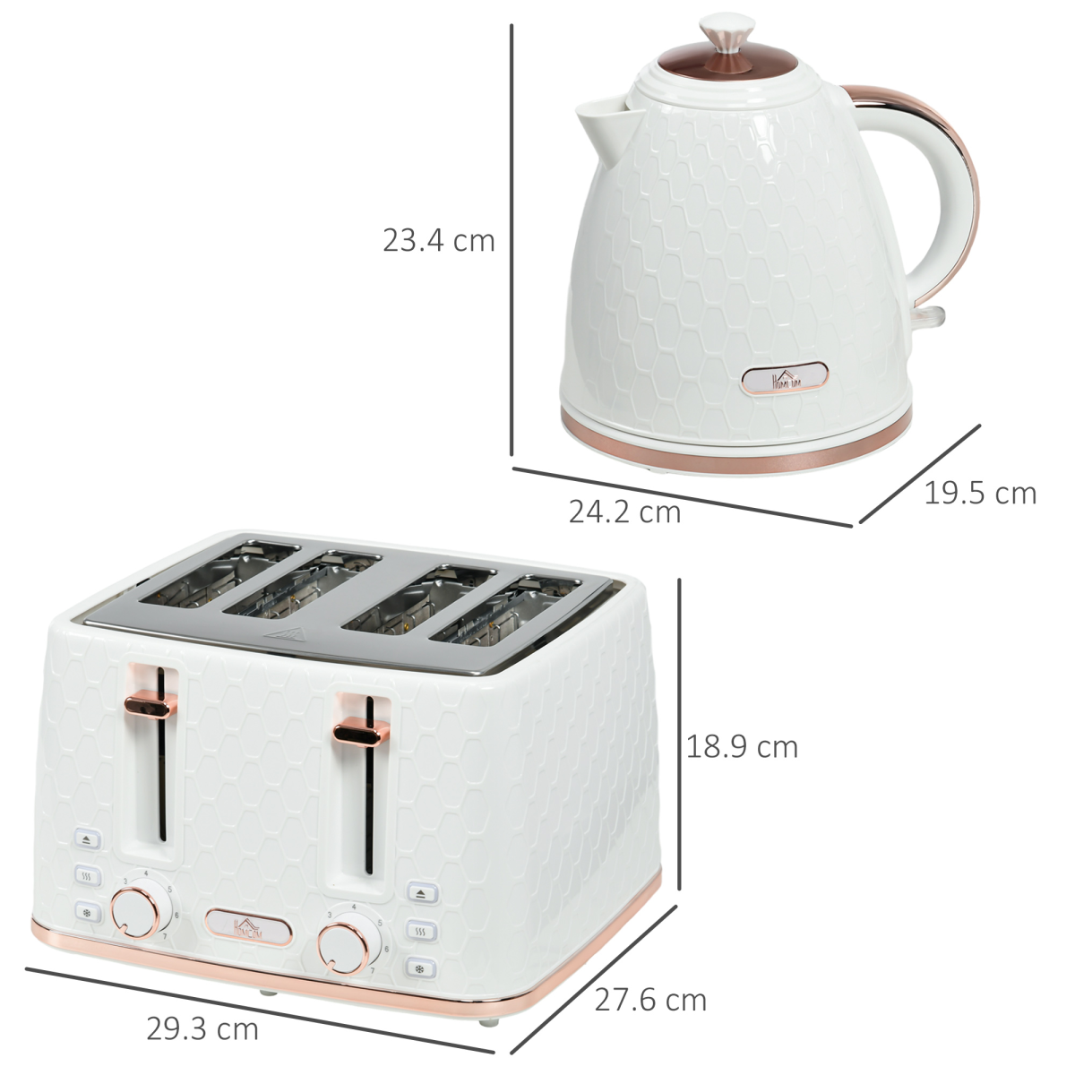 Elevate your kitchen aesthetics with the stylish and functional Kettle and Toaster Set. This beautifully designed duo includes a 1.7 litre rapid boil kettle and a four-slice toaster, both adorned with an elegant honeycomb pattern that effortlessly complements any kitchen décor.