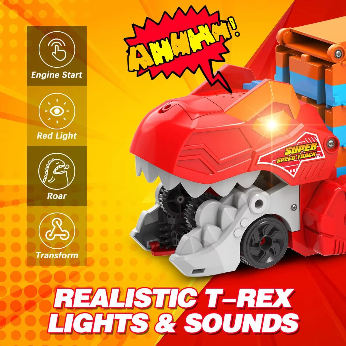 Dinosaur 3-in-1 Transport Truck with 8 Race Cars - Ejection Folding Portable Track Toy with Sound for Kids Age 3+