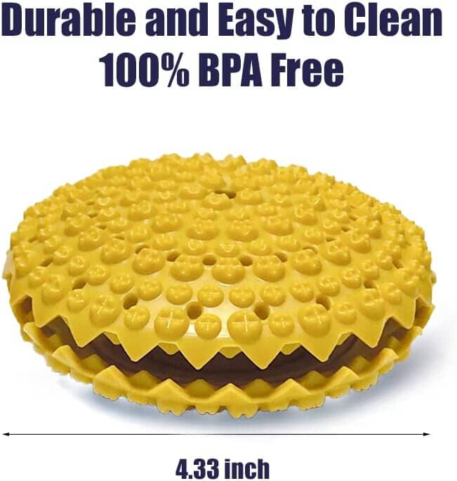 - 【FUN AND EASY CLEAN】Release your pet’s favorite treat while he plays. You can also spread herbal treats like peanut butter, yogurt, wet food or even catnip for your feline friends. Durable textured design helps keep your pets to find the last piece of treat.