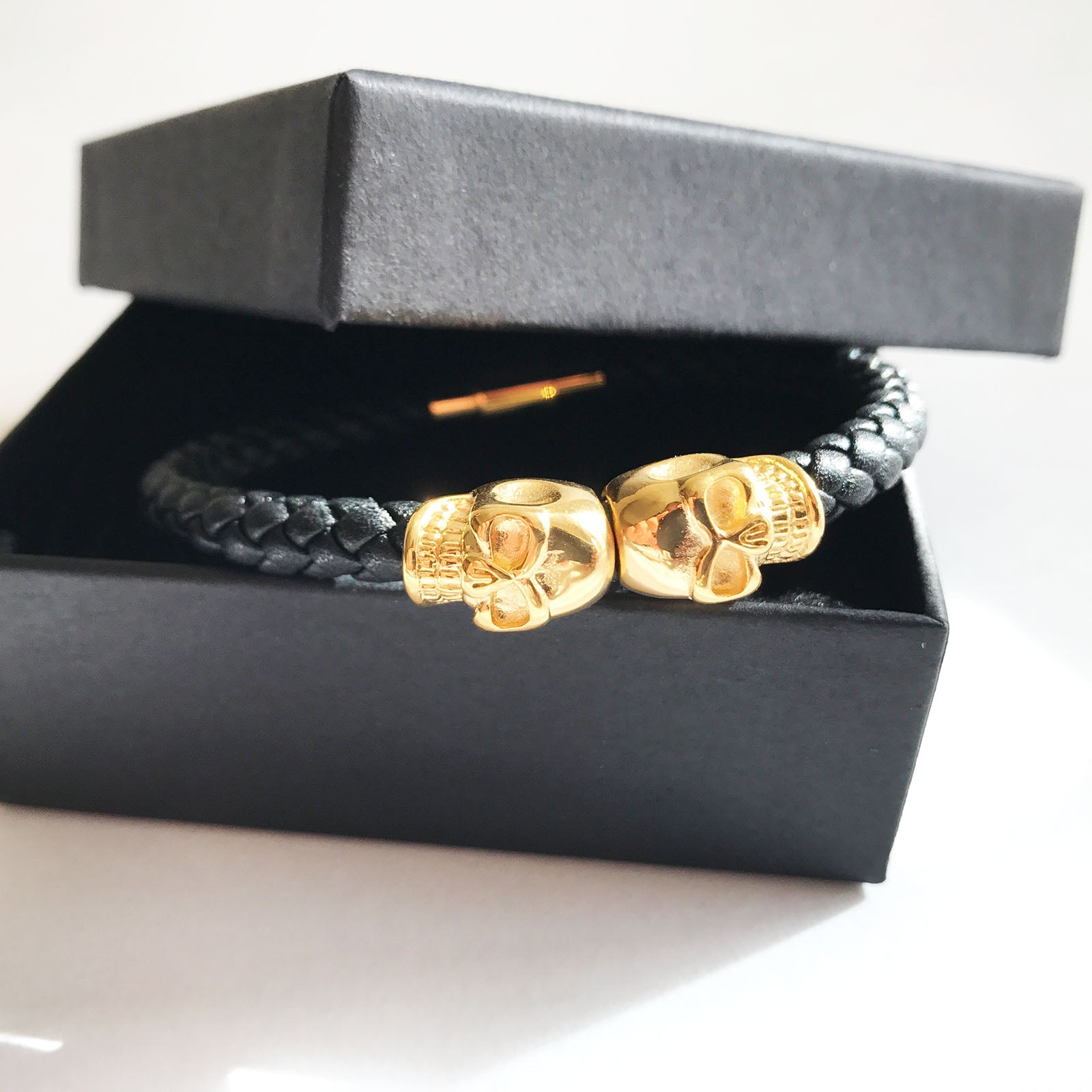 A premium bracelet made of leather and titanium and with a magnetic clasp! Unique twin skull design and unmatched quality! The bracelet comes in a delicate black gift box, delivered to make an impact!