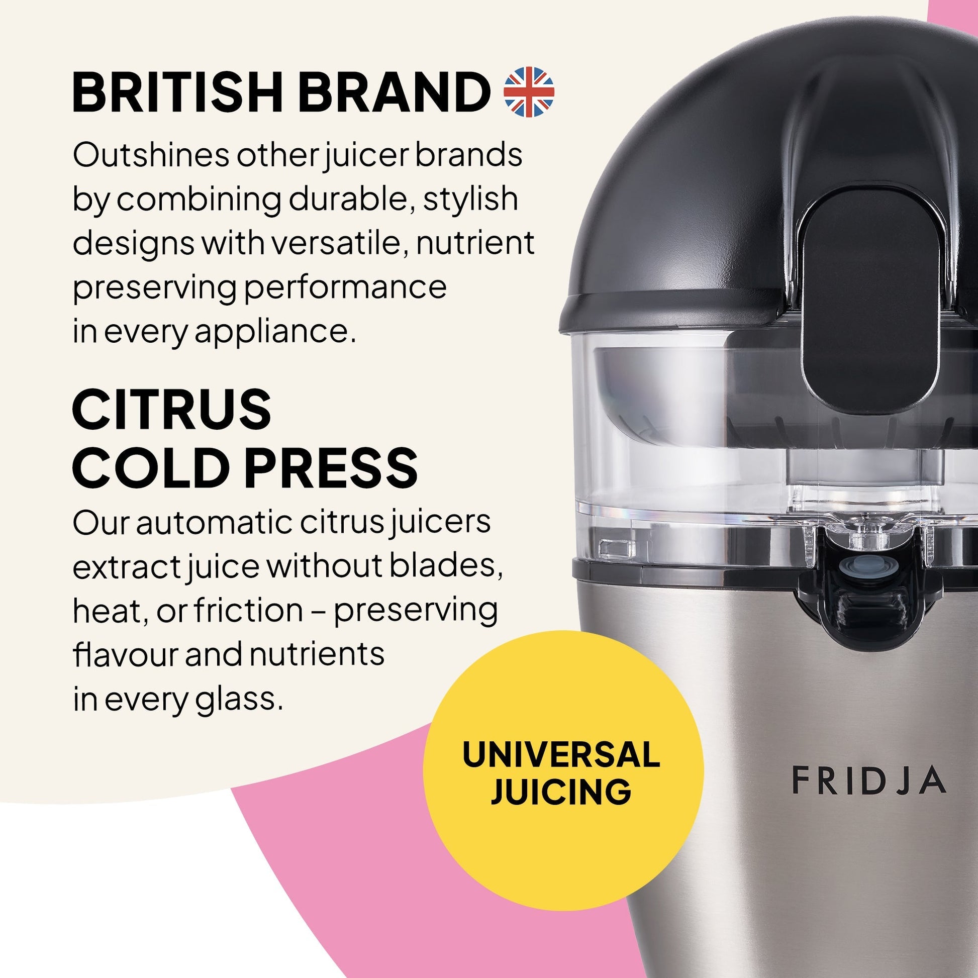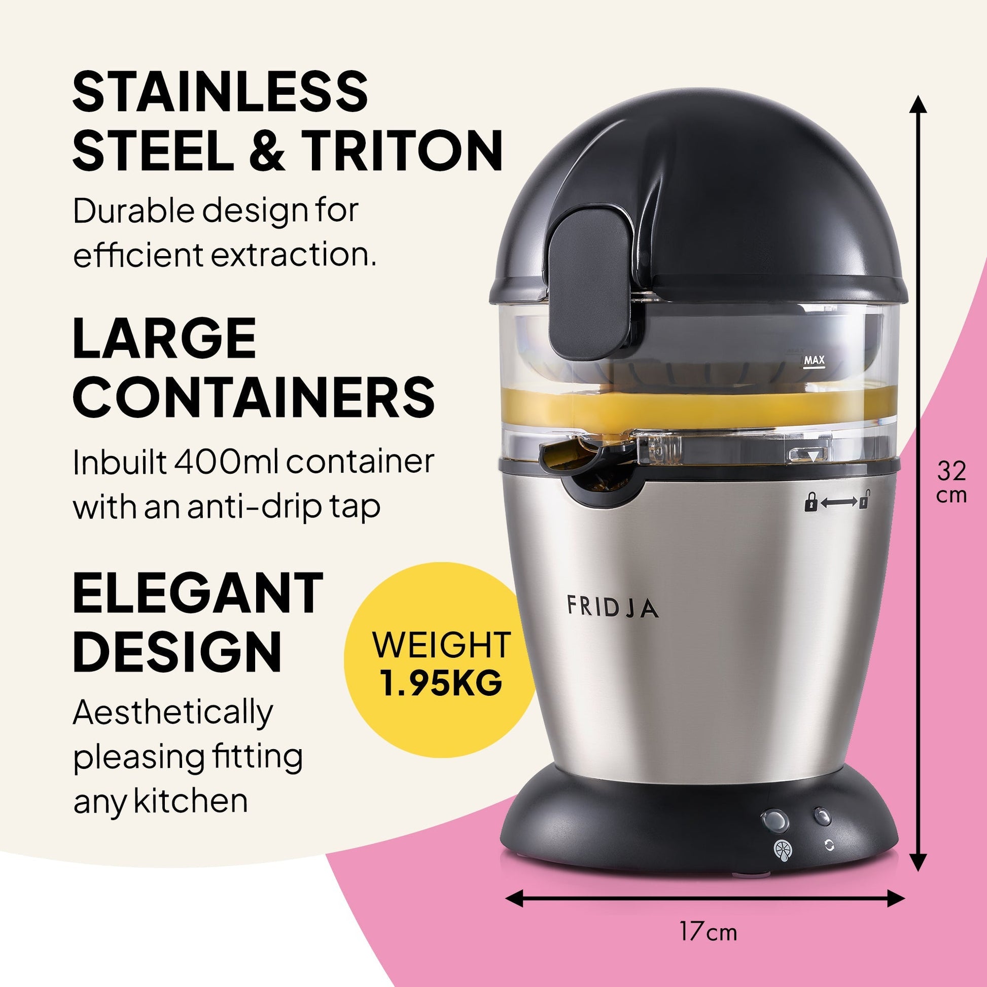 The Fridja f900 Automatic Citrus Juicer delivers fresh juice at the touch of a button. Just place your citrus fruit inside and close the lid. The motor activates automatically, pressing every drop cleanly and quietly.