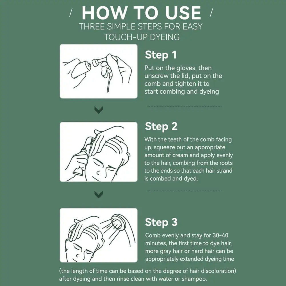 ● First step: Put on some gloves, unscrew the cap, insert the comb, tighten it, and begin combing and dying.
