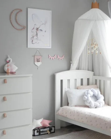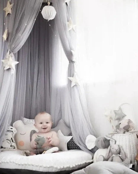 Create a magical atmosphere in your child's bedroom with our Kids Tulle Bed Canopy. The sheer tulle fabric, available in white, beige, pink, grey, blue, and purple, is adorned with delicate stars, adding a touch of elegance to any space. Transform their bed into a cosy and dreamy hideaway.