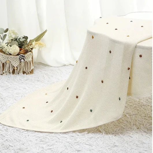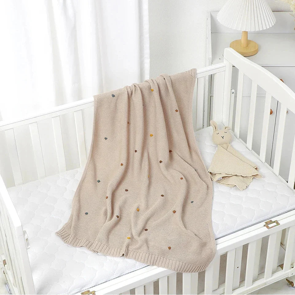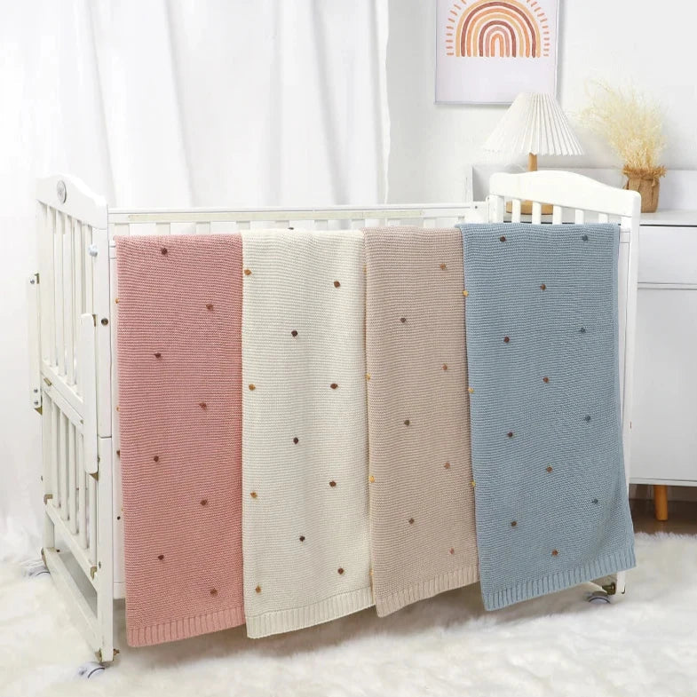 Wrap your little one in comfort and style with our Knitted Cotton Swaddle Blanket. Made with soft and breathable cotton, this blanket features a unique colourful knot detail in ivory, beige, pink, and grey. Keep your baby snug and stylish at the same time.