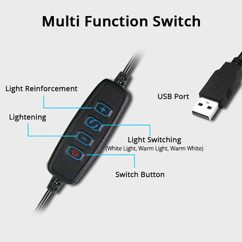 The USB ports can be used with multiple devices,such as connect USB charger, mobile power, computer host and laptop. You will be able to enjoy LED ring light at any time freely!