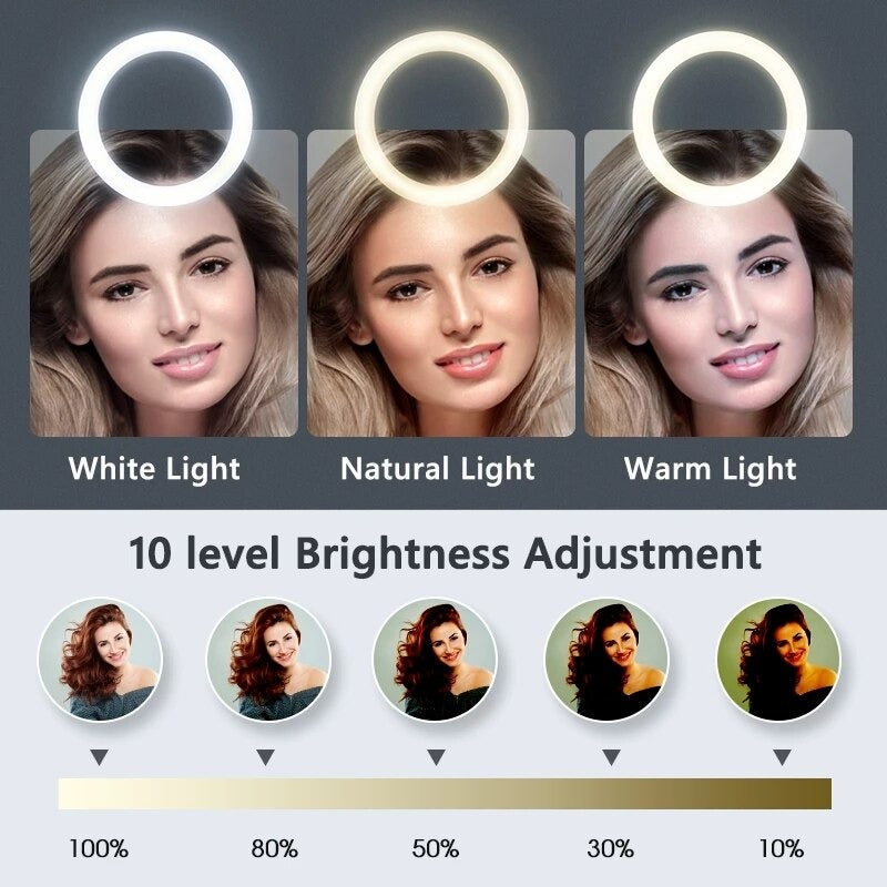 LED ring light comes with fix stand 360 Degrees & cell phone holder, it can help you whenever you need extra light for making up, taking photos, making videos, reading books, and live streaming !