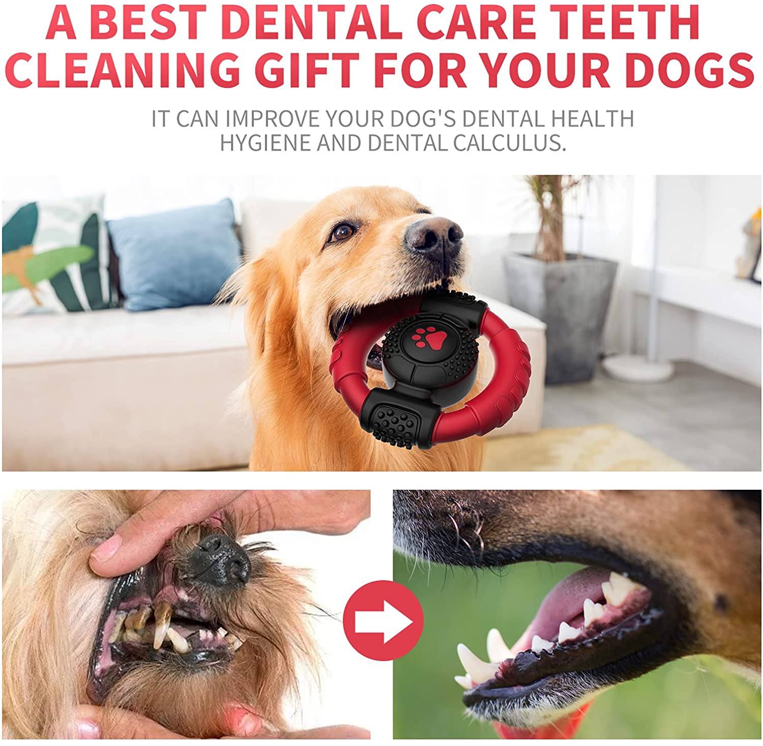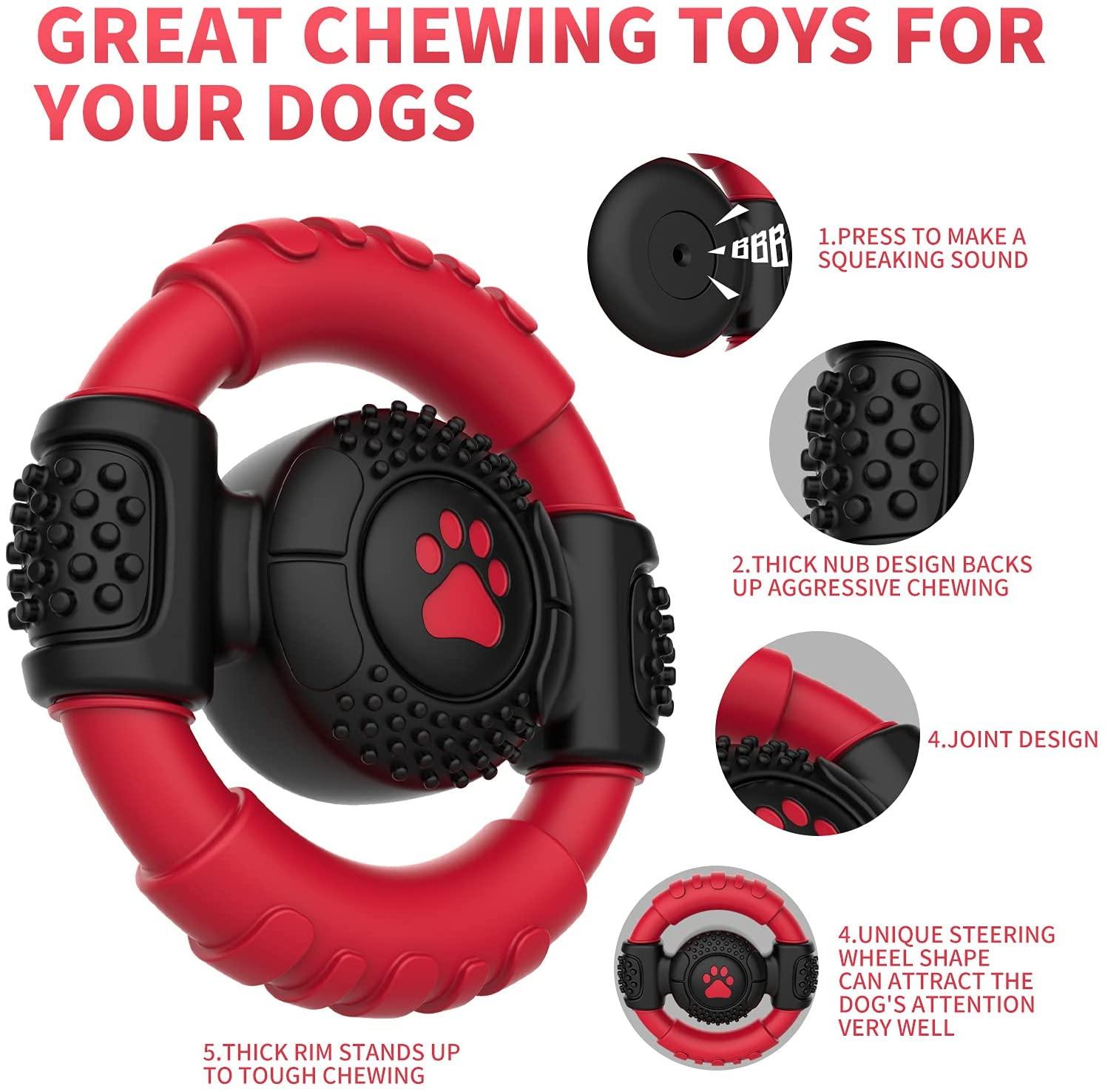 - 【Unique Steering Wheel Shape Design】If your dog tends to chew on wooden furniture or hard materials, this tough ring dog squeaky toy can keep them busy. The special steering wheel design is more novel, and the round rubber ring shape allows the dog to easily pick up the dog toy and chew. The rubber in the middle of the aggressive chew toys has a built-in sound hole that can be squeezed to make a squeaking sound. Screaming can attract the dog's interest and reduce boredom.
