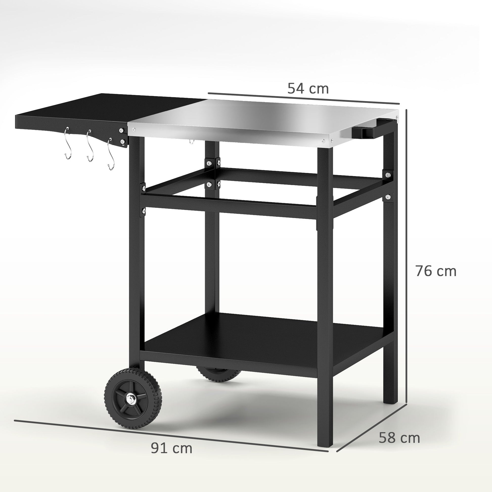 Elevate your outdoor entertaining game with the versatile Outsunny BBQ Trolley. Perfect for hosting friends and family, this all-in-one pizza oven table boasts an innovative design tailored for convenience and style. Crafted with a durable stainless steel tabletop, it features a foldable side table tray for additional prep space, along with a generous shelf and multiple functional hooks to keep your essentials organized. With its large wheels, this BBQ cart is easily portable, making it an ideal companion for meal prep and serving at picnics, BBQs, and family gatherings. Get ready to impress your guests with Outsunny!