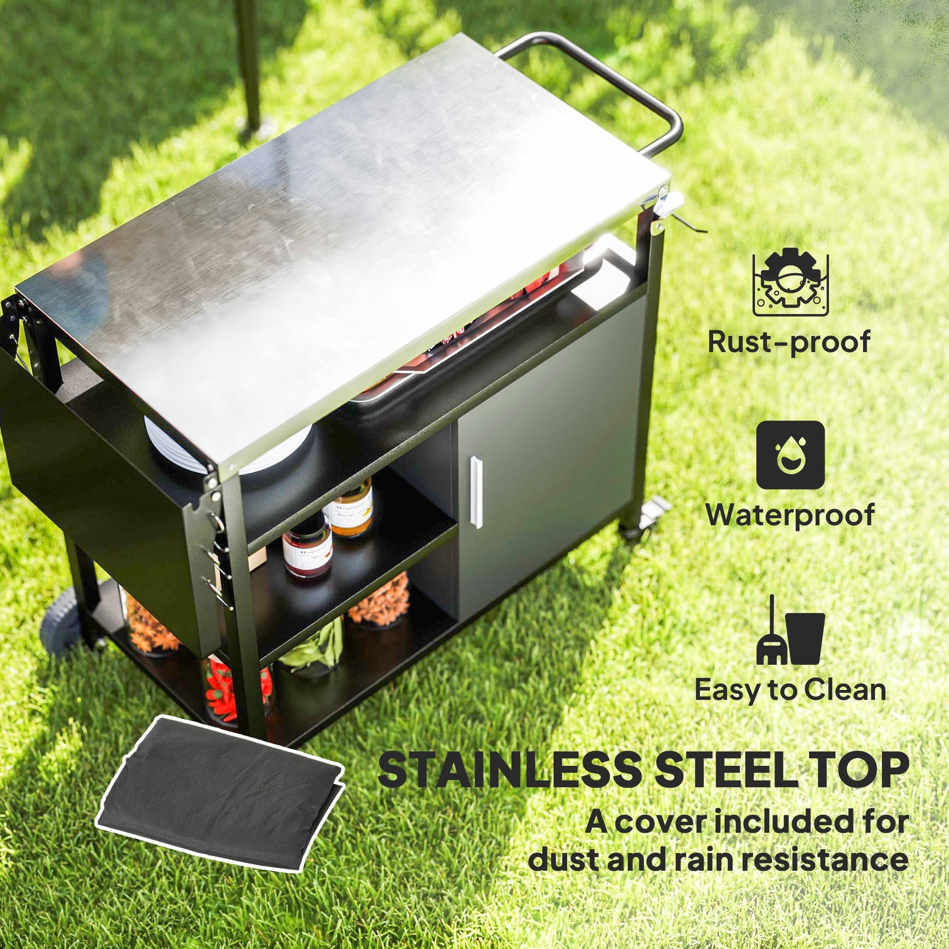 Mobility is a key feature of this outdoor BBQ trolley, as it glides effortlessly on sturdy wheels, allowing you to position it wherever your grilling desires lead you. Whether you're hosting a backyard barbecue or whipping up pizzas for a cozy gathering, this trolley is an indispensable addition to your outdoor setup.