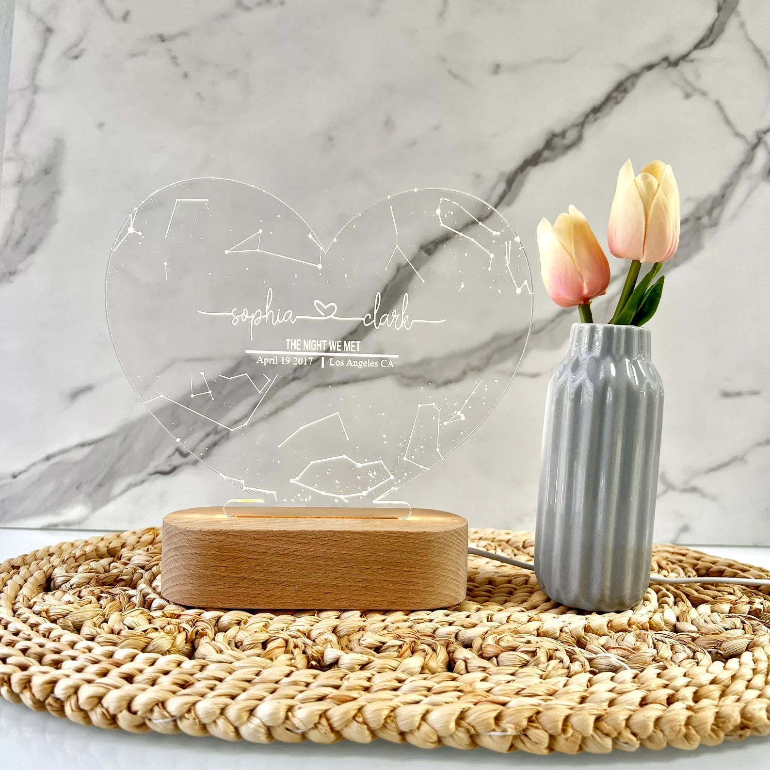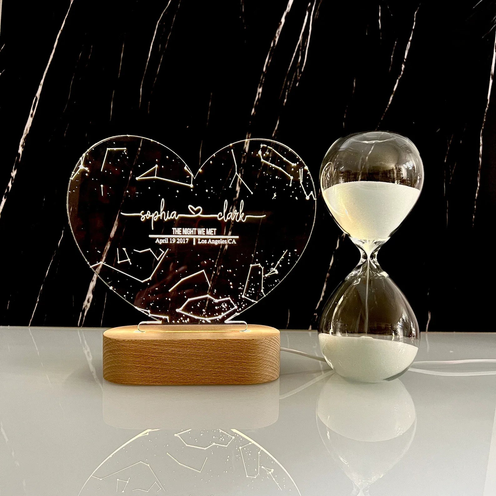 Introducing the Personalized Heart Acrylic Light "Starry Sky" – a magical LED glowlight that transforms your unique love story into a glowing constellation. Enter your names, a date, and location – and we'll recreate the exact starry sky from that unforgettable night. Etched into a heart-shaped acrylic frame with soft, ambient light, it becomes a romantic masterpiece for your home or the perfect gift for anniversaries, weddings, or “just because.”