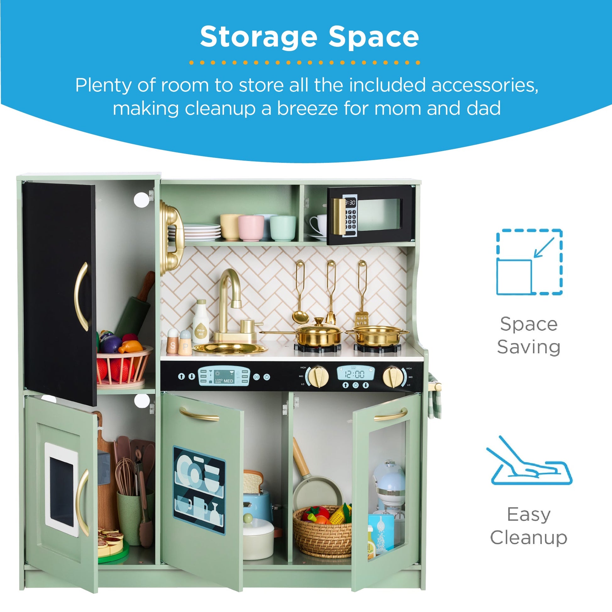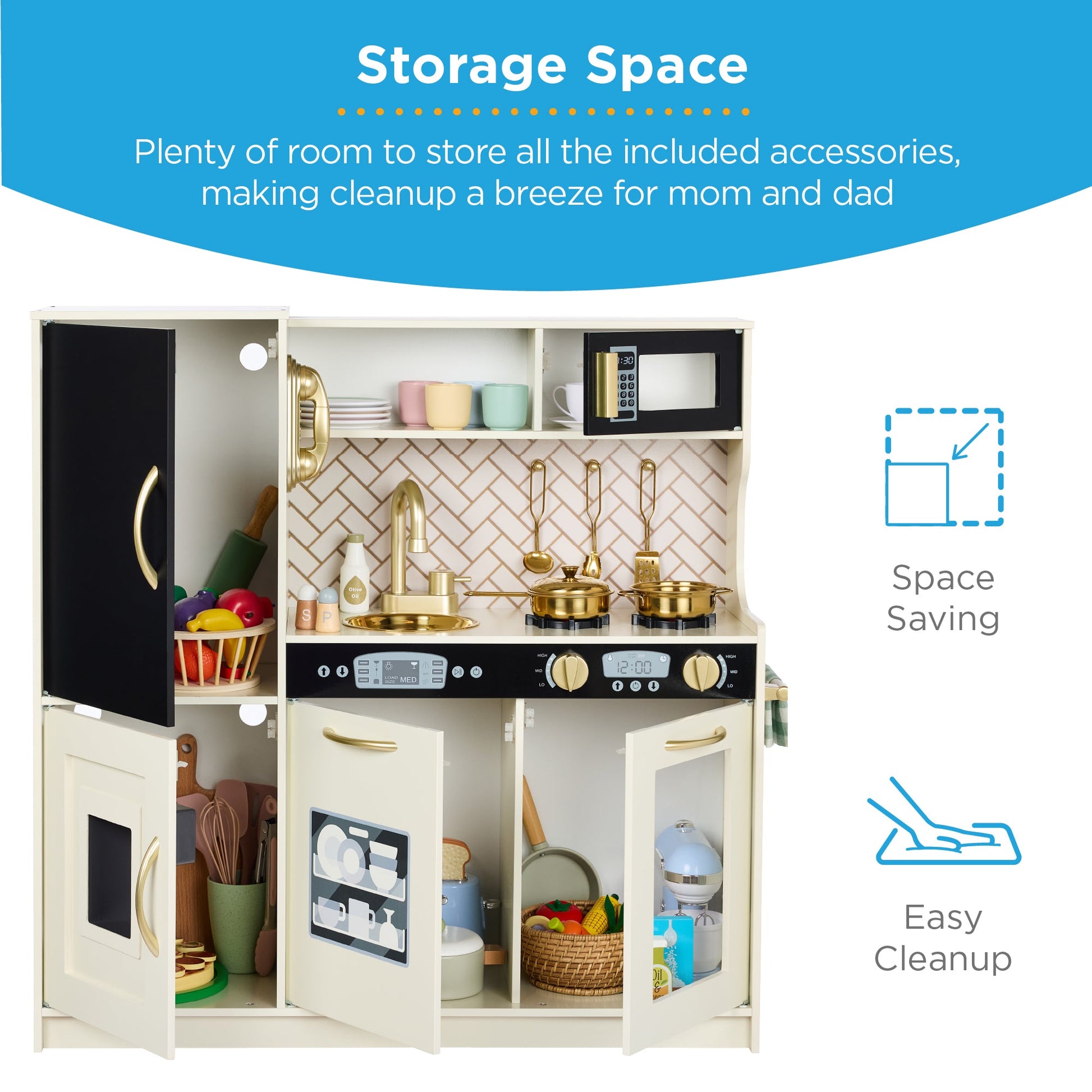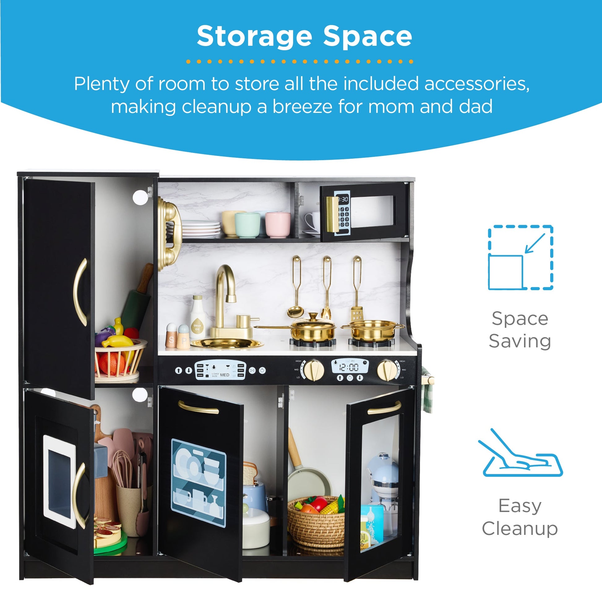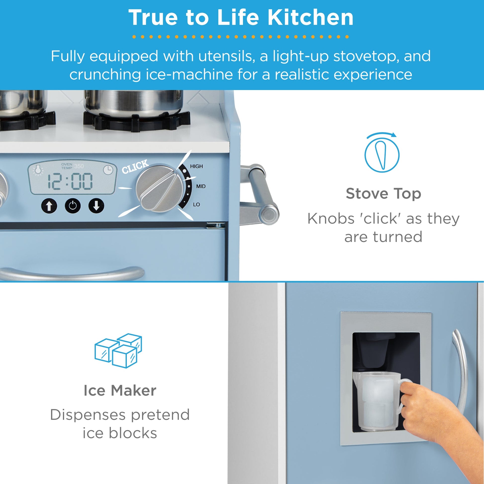 11 ACCESSORIES INCLUDED: Set includes 3 utensils, 2 pots, 1 lid and kitchen comes with an ice maker that dispenses 4 ice cubes, and cordless phone; keep the accessories in the overhead shelf, the oven, in the fridge, freezer, microwave, or dishwasher