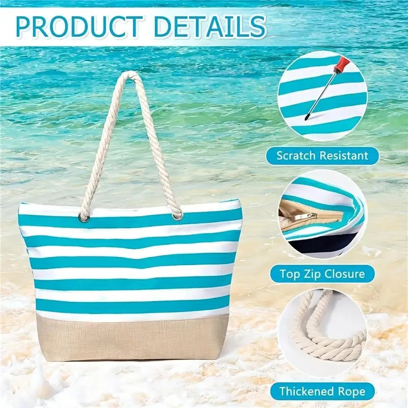 Summer Canvas Striped Tote Bag – Large Beach Shoulder Bag with Zipper for Travel & Swimming