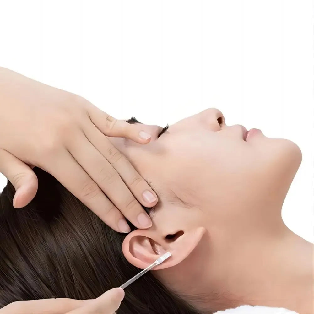 ● Take a stick, place the tip near the earwax, and slowly rotate the earwax remover.