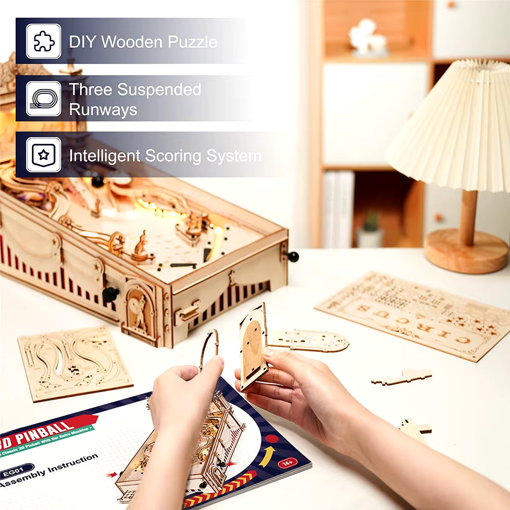The ROKR 3D Pinball Machine is not just a game; it is a hands-on project that encourages creativity and strategic thinking. With 482 wooden pieces, the assembly time is approximately 7 hours, making it an ideal weekend activity. Once completed, players can enjoy the thrill of scoring points by hitting targets, with different scores assigned to various challenges. The vibrant LED lights enhance the visual appeal, making it a stunning centerpiece for any tabletop. Suitable for ages 14 and up, this game is designed to be enjoyed by everyone, from young adults to seniors, ensuring that fun knows no age limits.