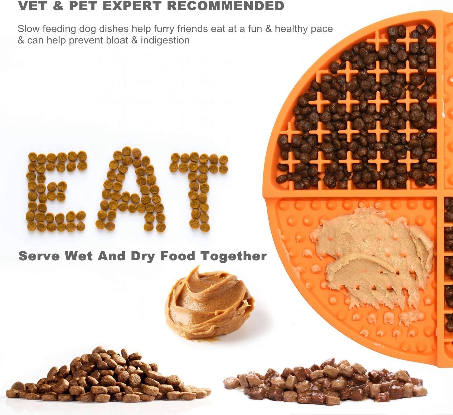 - SERVE WET AND DRY FOOD TOGETHER:Unique quadrant design allows the dog slow feeder to accommodate dry, wet and raw food diets at once without making a mess.Two surface patterns for different food:The crosses part is perfect for small kibble, raw and dry foods.the dots part for runny foods and spreadable treats.