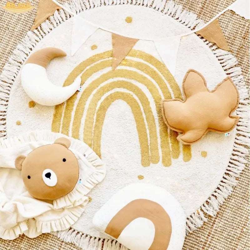 This soft white play mat is accented with colourful rainbow and tassel detail in yellow, blue, and pink. It's sure to bring a smile to your little one's face!