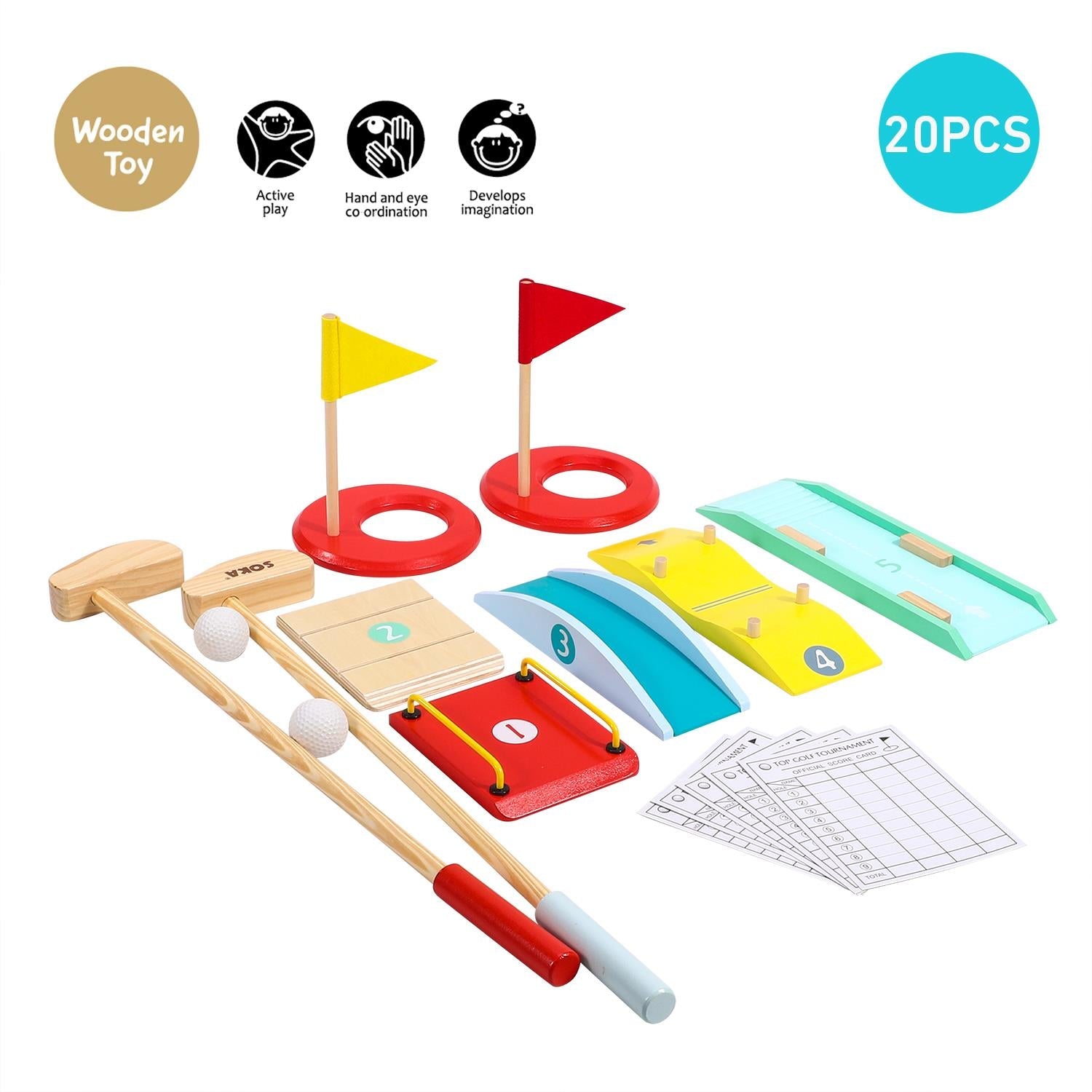 - 2 wooden golf clubs (62cm tall) for easy gripping by small hands