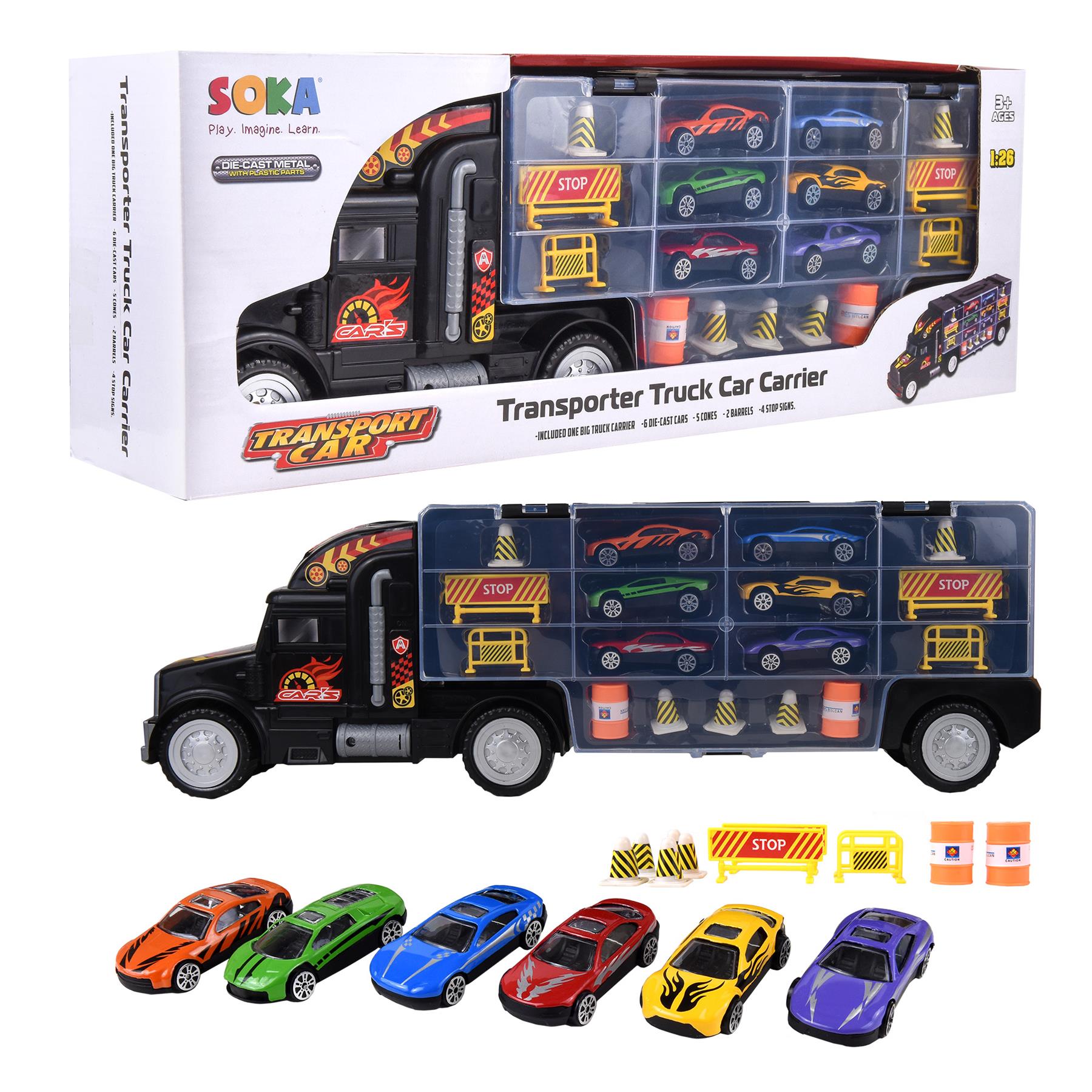 Complete Highway Set: The SOKA transporter truck car carrier set comes with everything your child needs to create an exciting miniature road transport scene. It includes 1 large truck carrier, 6 die-cast metal cars, 5 traffic cones, 2 barrels, and 4 stop signs.