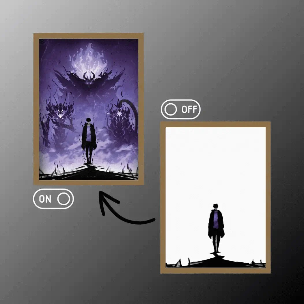 Bring him to life with our handcrafted LED artwork! The Sung Jin-Woo – Solo Leveling LED Frame fuses artistic craftsmanship with dynamic light technology. By day, it’s a minimalist sketch. But with a flick of a switch, it transforms into a breathtaking illuminated tribute—a glowing scene of power, mystery, and anime perfection.