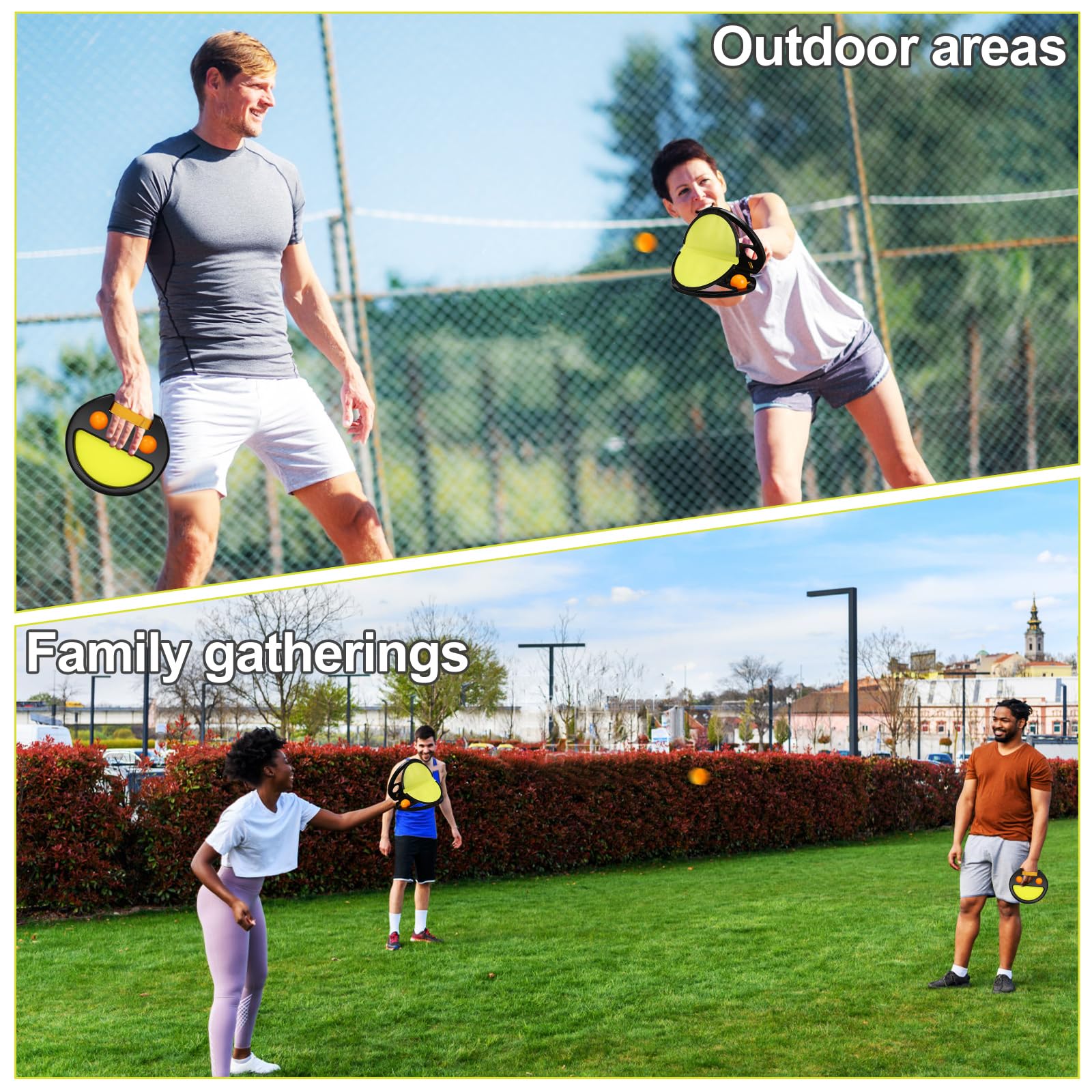 Easy as it is fun! Simply strap on your paddle using the adjustable straps, grab the soft ball, and toss it to your partner. The hoop-and-loop surface on the paddle helps you catch the ball effortlessly. Take turns throwing and catching, challenging each other to faster throws or trick shots. Great for pairs, teams, or solo practice, this game can be played just about anywhere – indoors or outdoors, on the beach, at the park, or in the backyard.