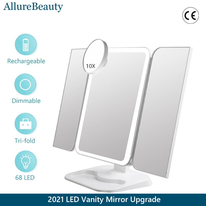 Trifold Makeup Mirror With Light 68 LED Vanity Mirrors 10X Magnifying 180Rotation
