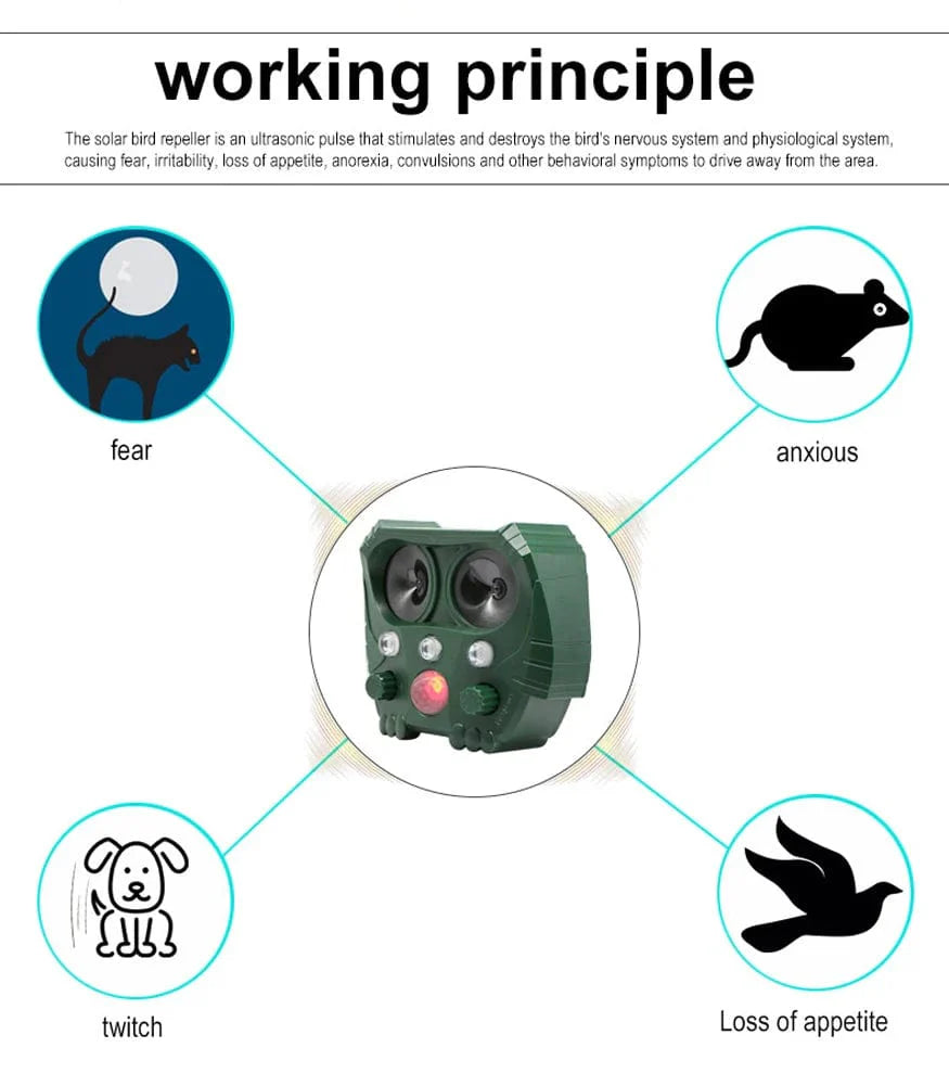 Animal Solar Powered Pest Motion Activated Repeller! With its solar powered design and ultrasonic technology, it's a perfect solution for deterring unwanted animals.
