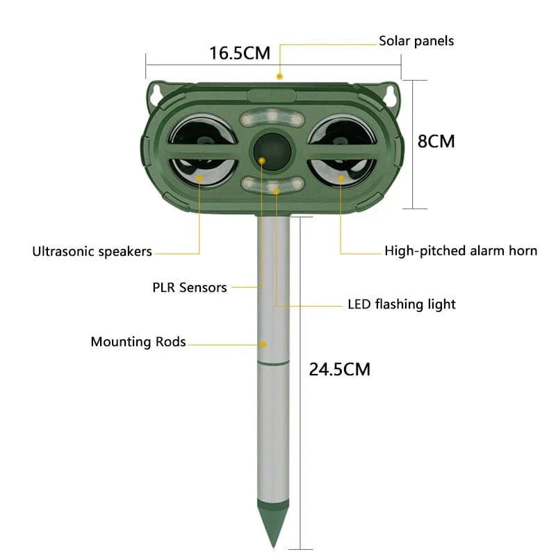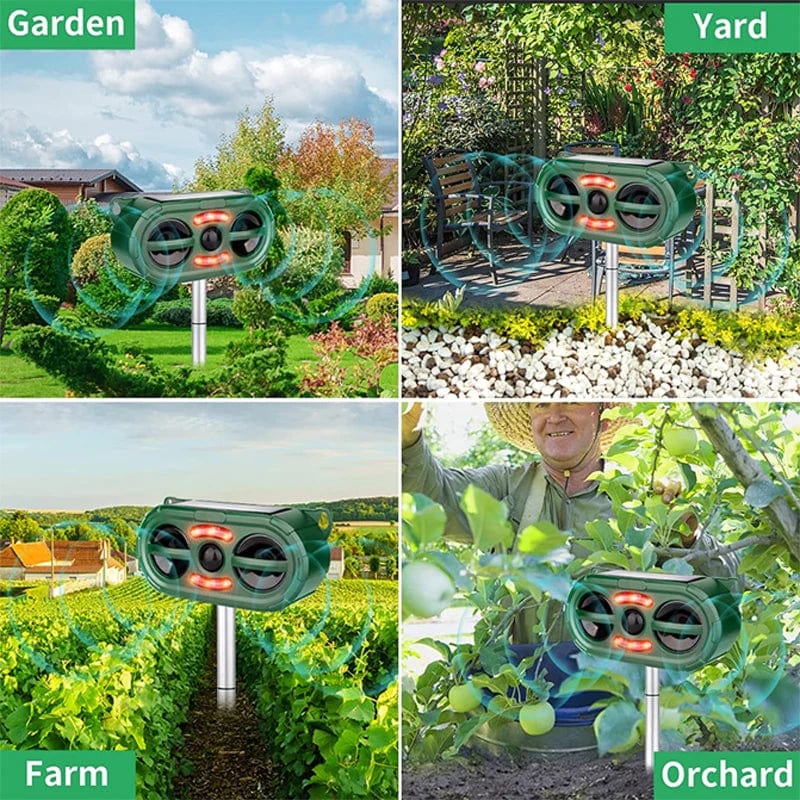 - Our ultrasonic solar animal repeller detects pests using a PIR infrared sensor and emits an ultrasonic sound that humans cannot hear but effectively repels dogs, cats, skunks, and other animals. This safe and humane device protects your farm, garden, park, lawn, or yard from unwanted visitors. With this repeller, you can protect your plants and outdoor areas from stray cats, dogs, raccoons, and deer with peace of mind.