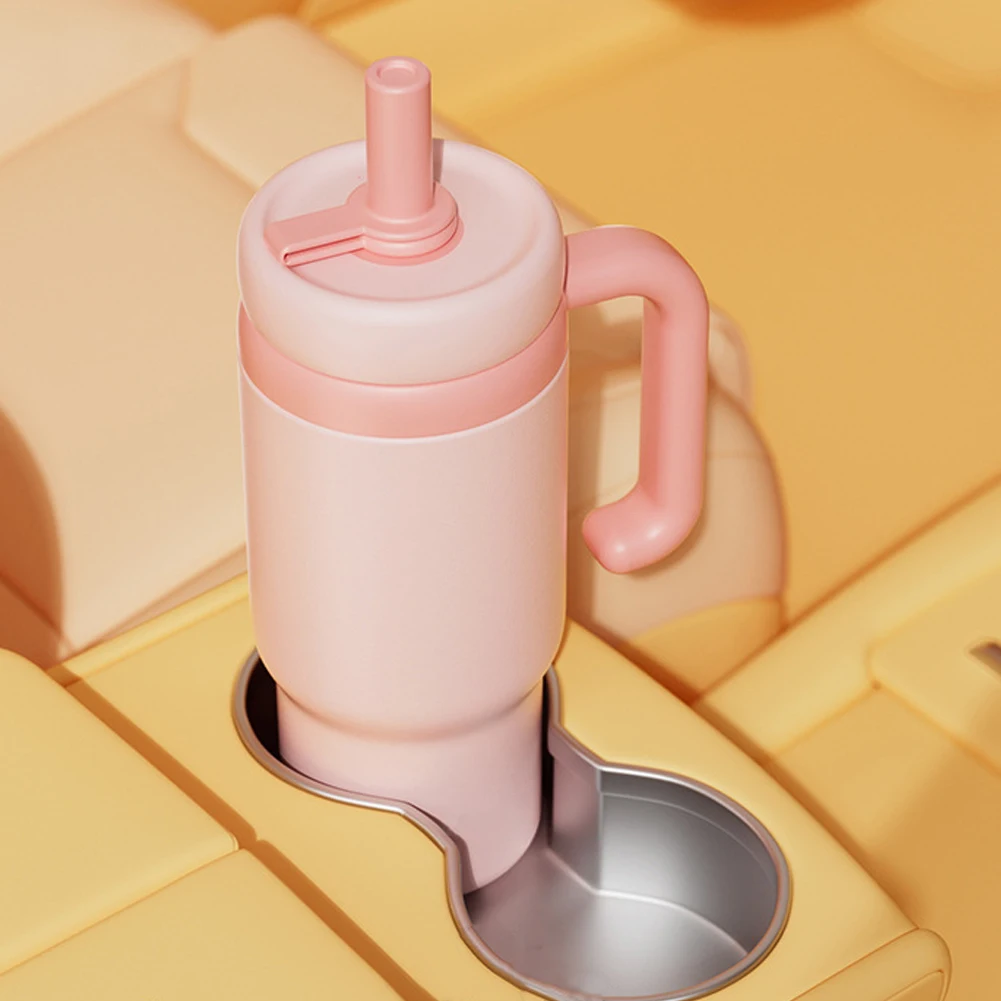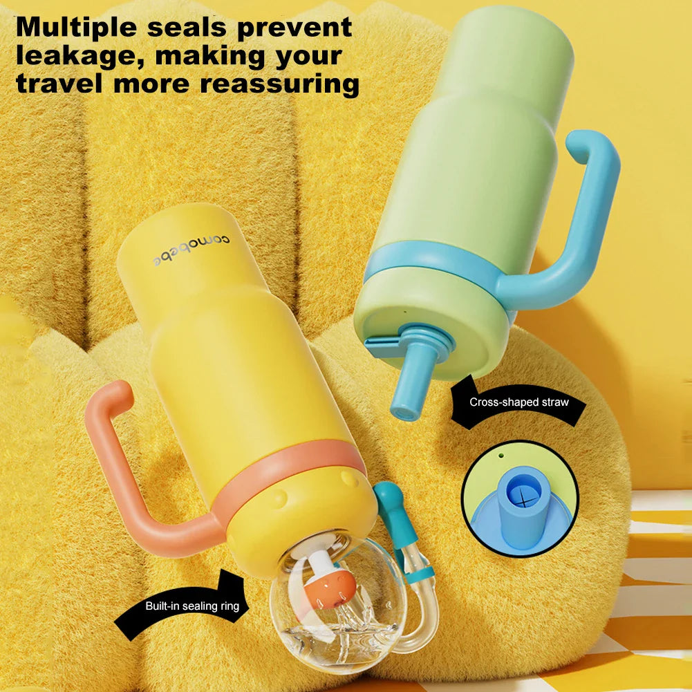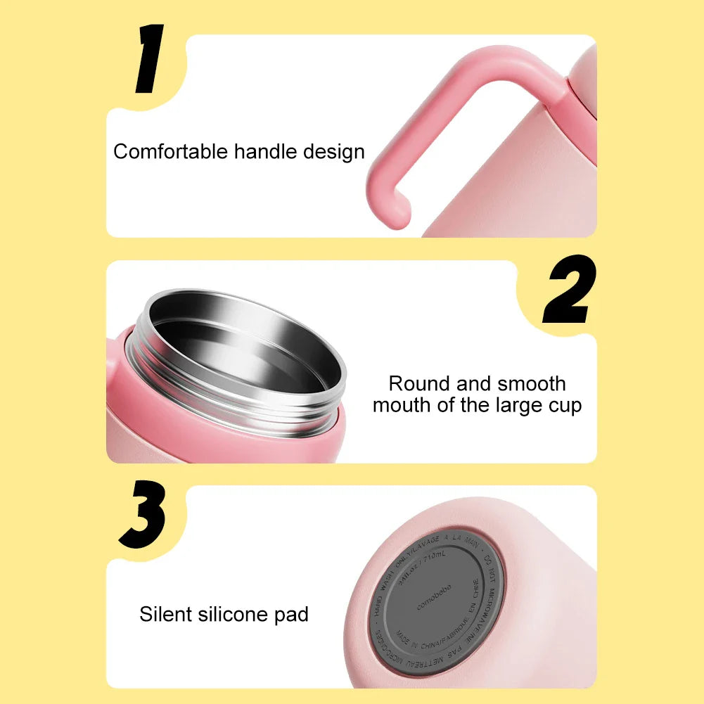 ● User-Friendly: Equipped with two lids (fountain lid and direct drinking lid), offering multiple drinking options. The ergonomic handle ensures a comfortable grip for drinking from any angle. The silicone base reduces noise, is non-slip, and enhances stability.