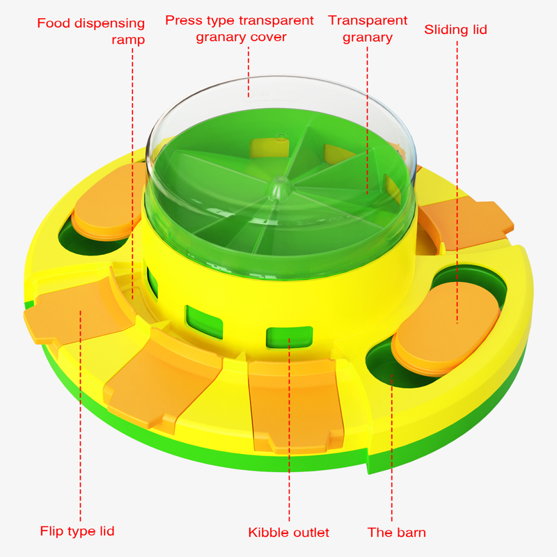 The top of the toy is designed with a food leakage turntable, There are several rotatable food leakage boxes on the track of the turntable.