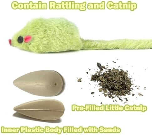 - 1. 12PCS Cat Mouse Toy Pack : 12PCS faux fur mouse cat toy for your feline friend, 6 bright colors mixed. Simply toss it to your cat and watch as they pounce, chase, bat at this mice and toss them around. The rattle and catnip can get cats obsessed and will keep them entertain themselves throughout the day, benefit to keep active and healthy for indoor cats.